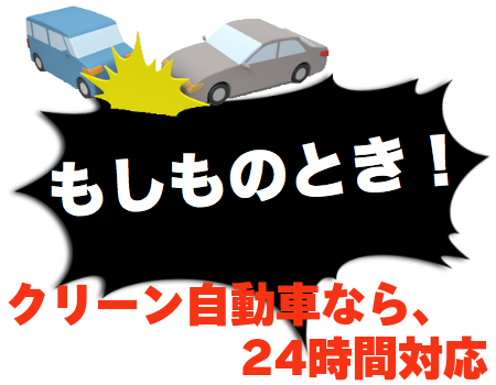 24時間ロードサービス連絡受け入れ態勢を取っておりますので、どんなときでも、お客様の「困った!」に対応させて頂いております。最寄りの車屋さんで受け入れてもらえなければ深夜でも入庫可能です。無料代車のご用意もございます。安心して乗ってこその自動車です。サポートにはぜひクリーン自動車をお選び下さい。